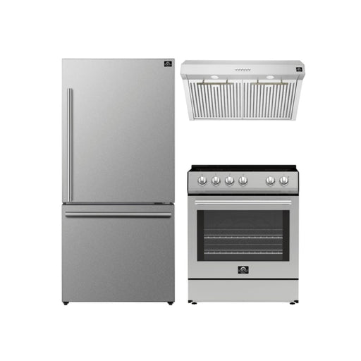 FORNO Premium 3-Piece Kitchen Bundle - Leonardo Espresso 30" Stainless Steel Range, 31" Stainless Steel Bottom Freezer Refrigerator, 30" Stainless Steel Under Cabinet Range Hood - FBDL-001-01US