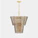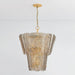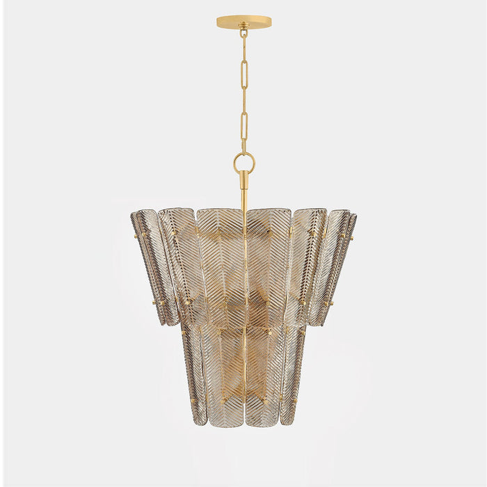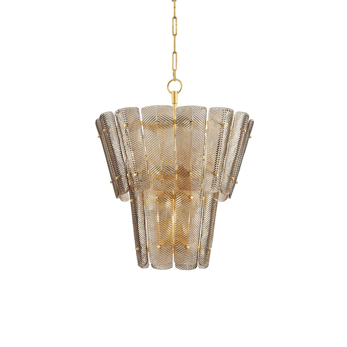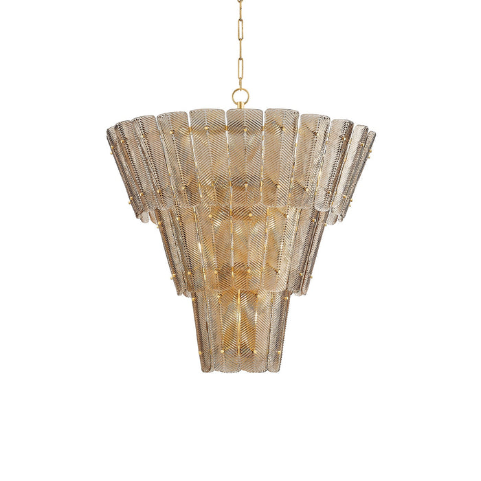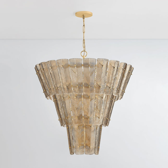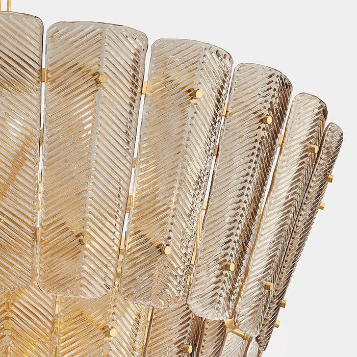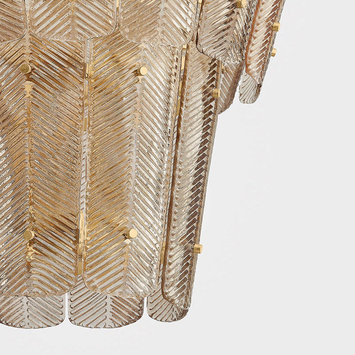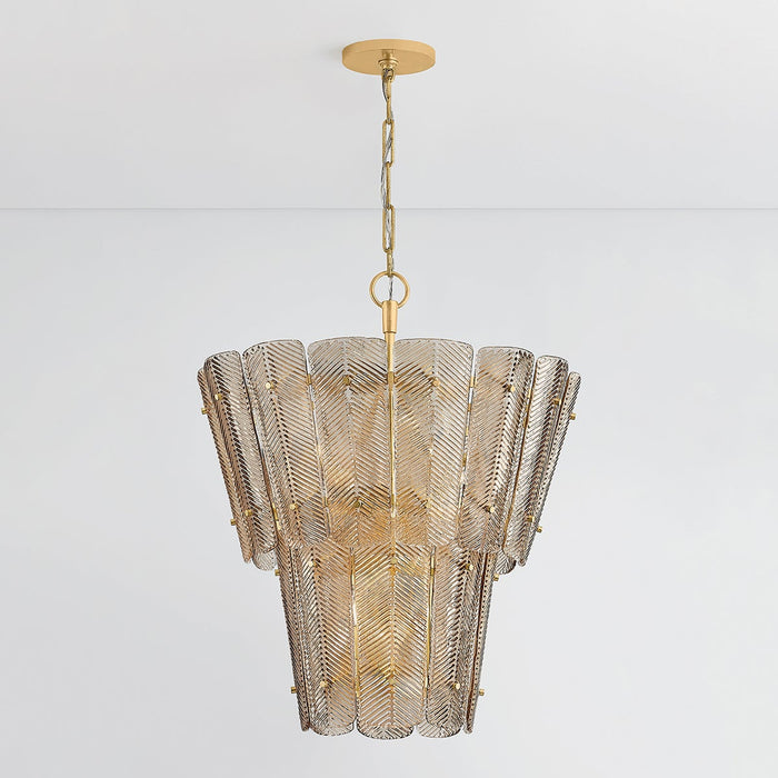 Inspired by Parisian design aesthetics, this graceful tiered glass chandelier is a showstopper. Slender plates of fluted piastre glass are secured to a delicate framework with fine, jewelry-like pins. The glass features an optic chevron pattern that mimics the pattern on leaves, adding textural depth.
