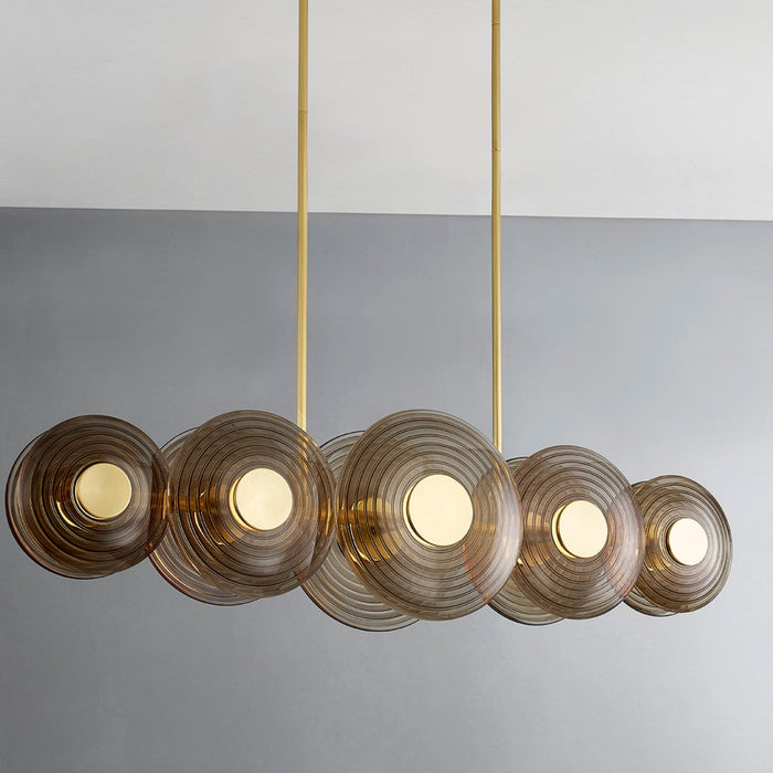 Discs of ribbed clear smoke glass capped in Aged Brass take cues from rippling waves to create the glamourous retro aesthetic of Griston. When lit, this vintage-inspired design casts a warm, golden glow, delivering just the right amount of sparkle.